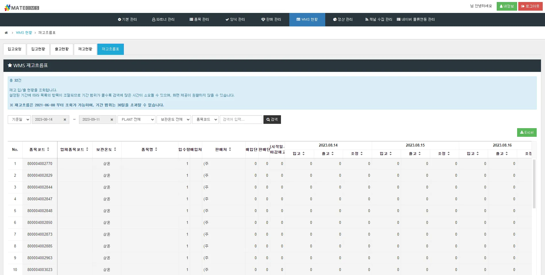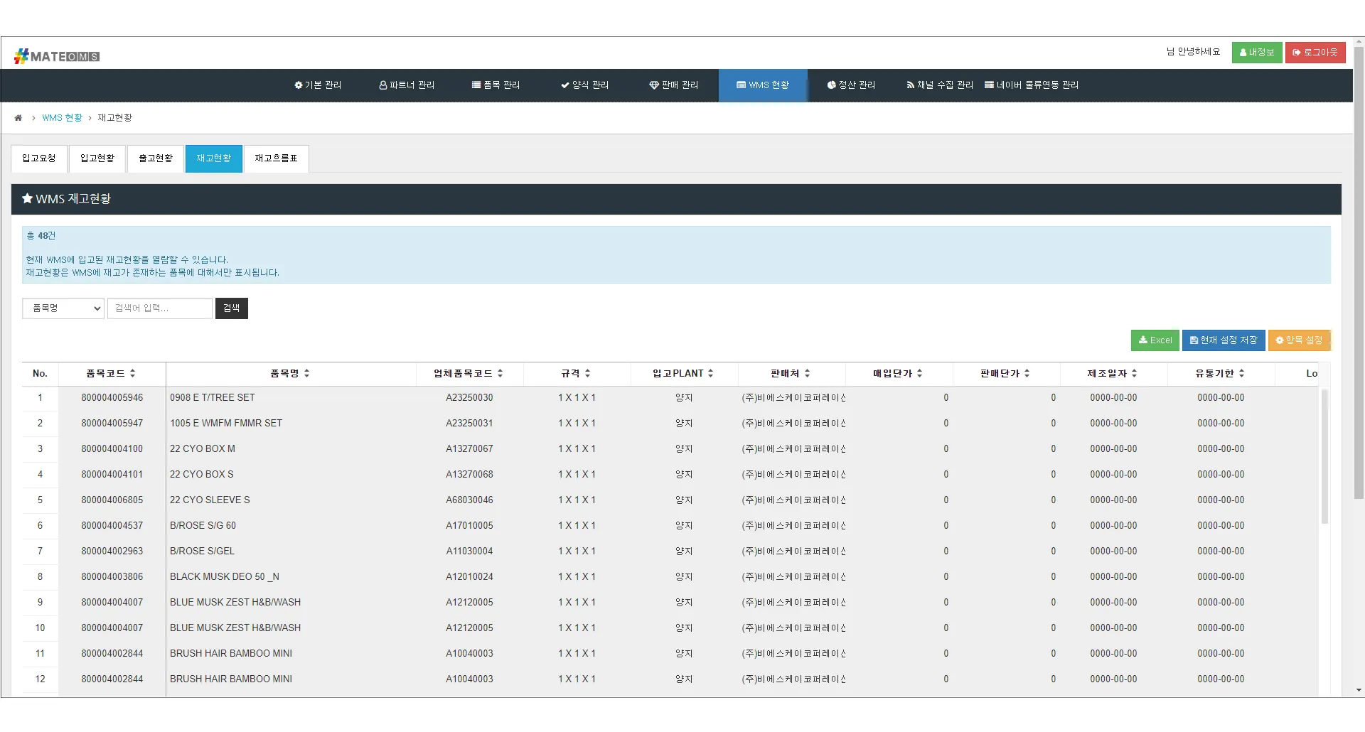 [WMS 현황] > [재고현황]에서 현재 #MATE 시스템 상의 재고정보 조회 가능