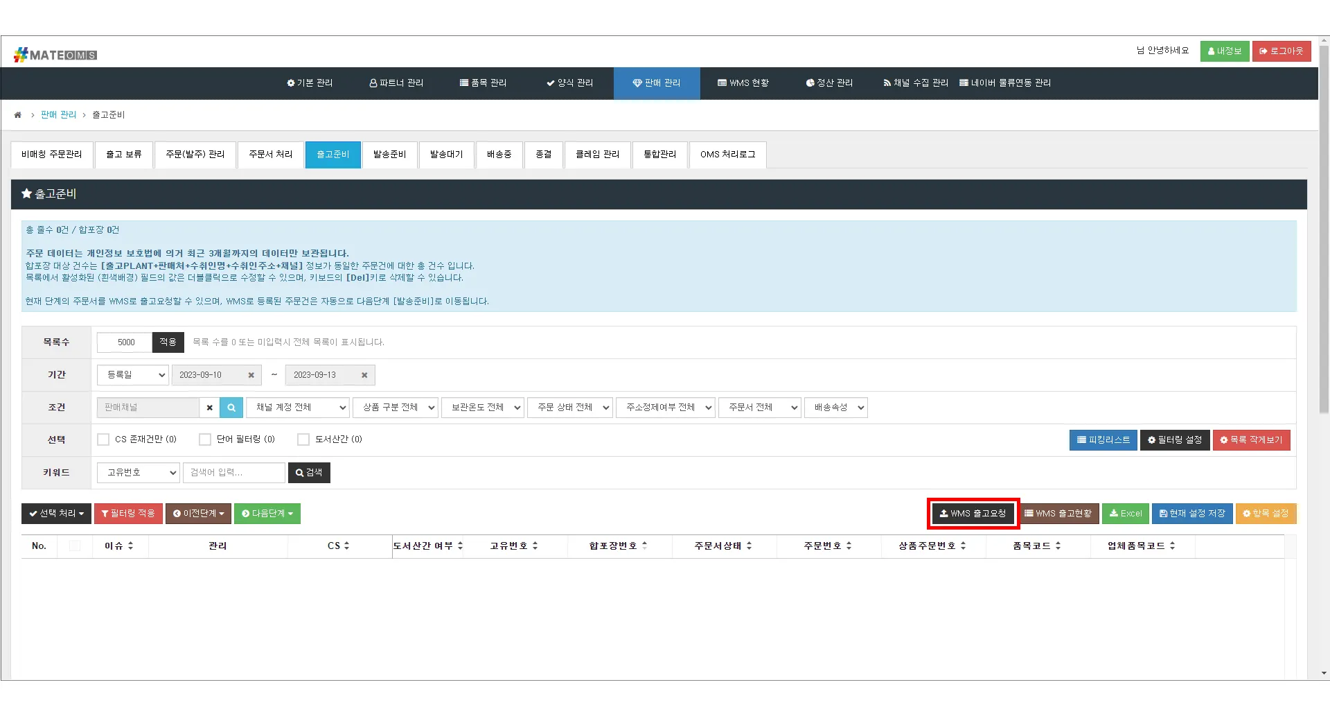 3. [WMS 출고요청] 버튼 클릭