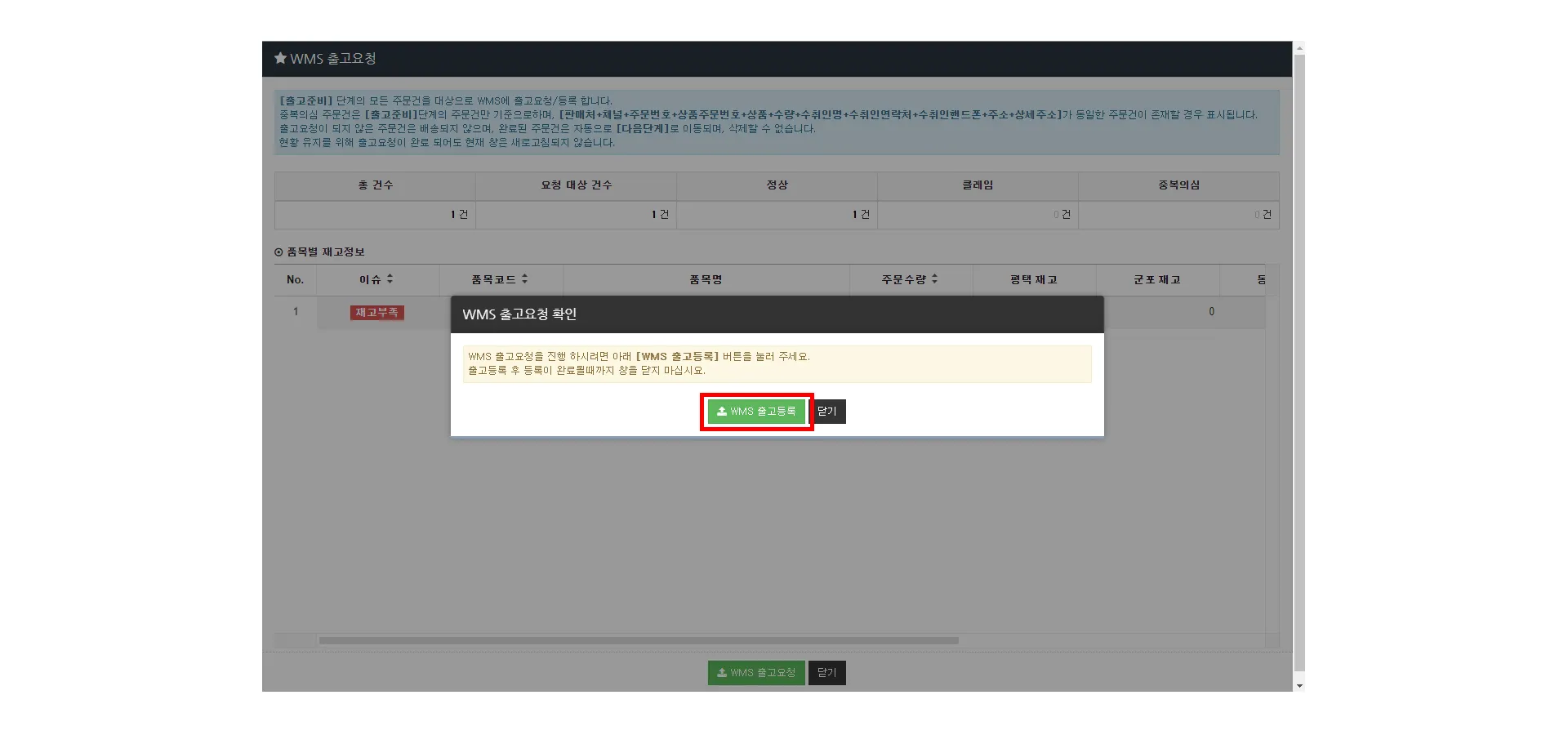 4. [WMS 출고등록] 버튼 클릭