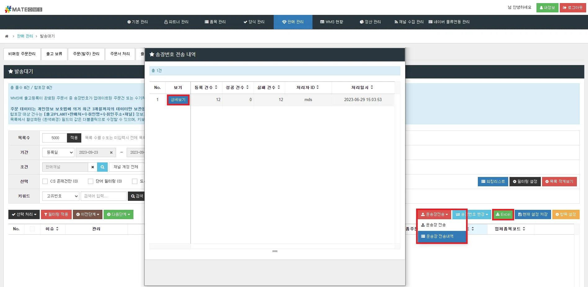[운송장 전송] > [운송장 전송내역] 버튼 클릭 시 #MATE가 전송한 운송장 목록 확인 가능
