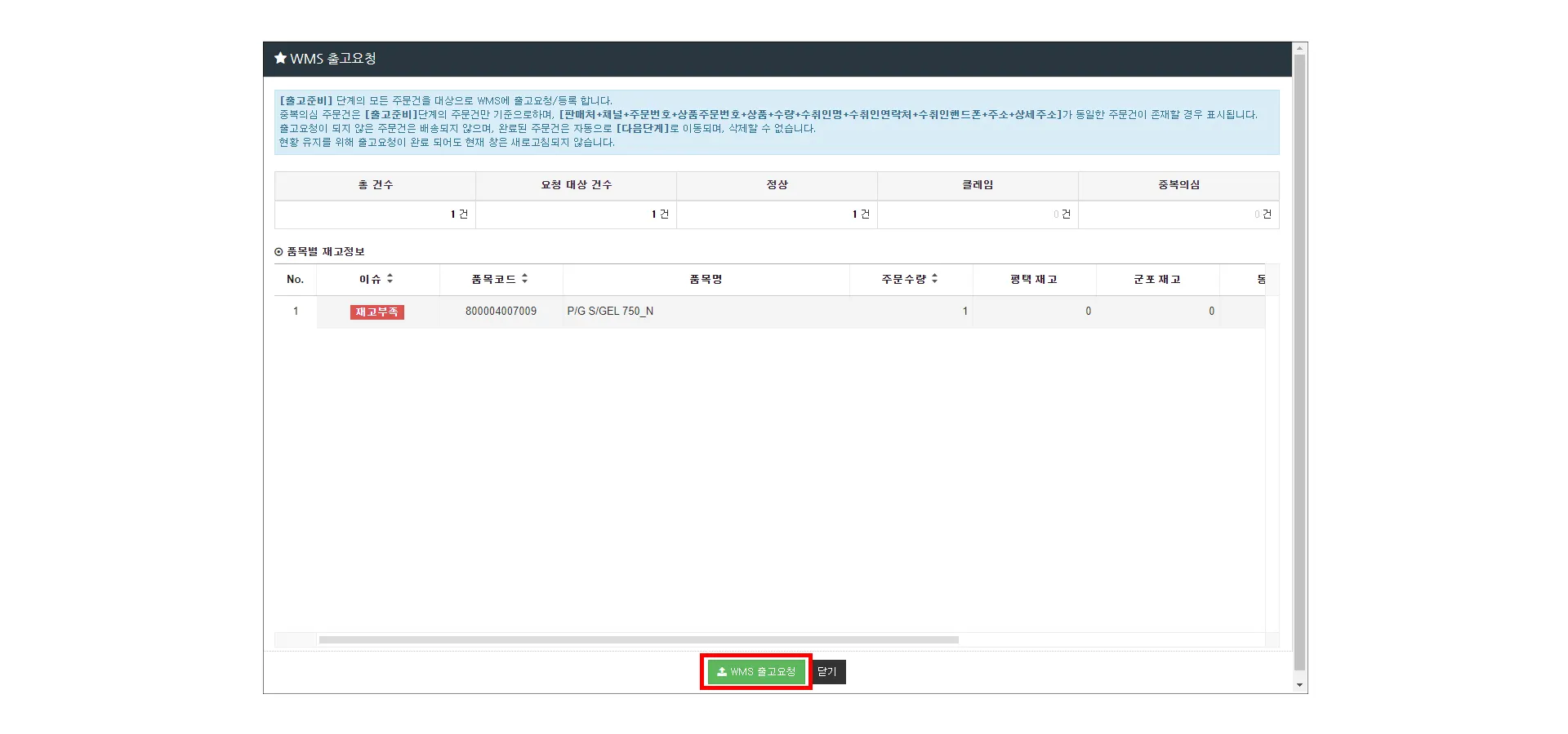 2. [WMS 출고요청] 버튼 클릭