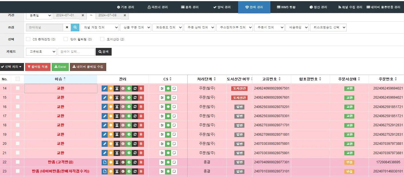 a. 판매관리 > 통합관리에서 주문번호 또는 송장번호를 검색