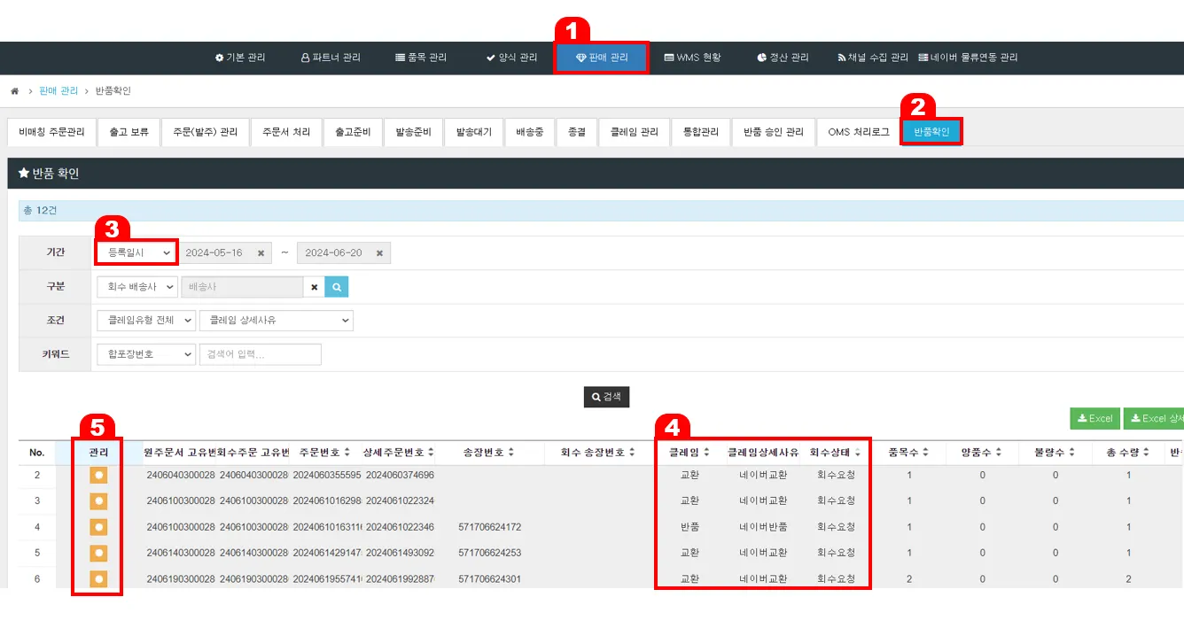 [판매관리] > [반품 확인] : 회수요청 자동 등록 내역 조회 가능