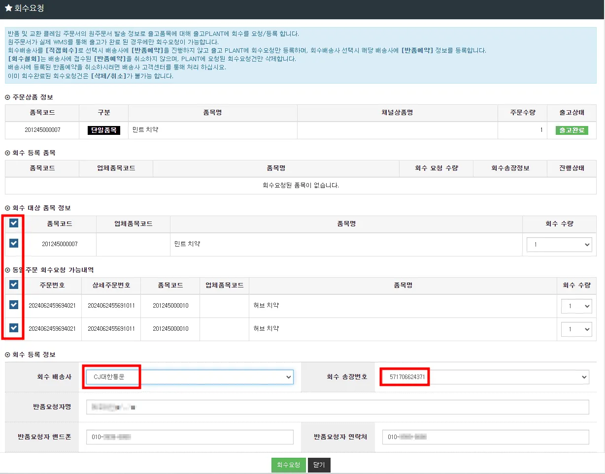 선택한 클레임 외에 동일 송장 내에 다른상품 회수가 필요할 시, [동일주문 회수요청 가능내역] 의 상품도 함께 체크