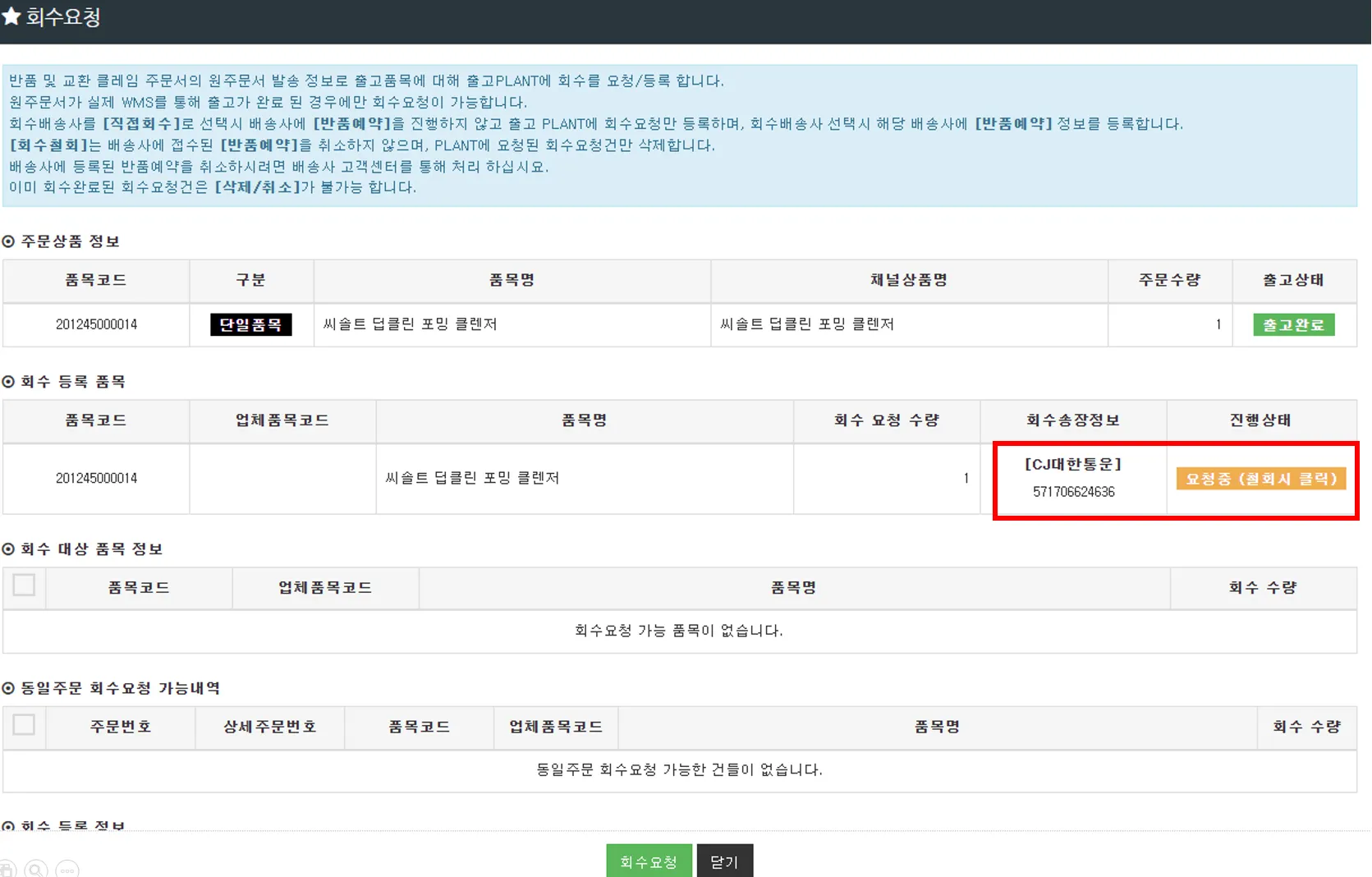 a. 회수요청 창에서는 어떤 송장에서 어느 상품을 몇 개 회수할지 입력 후 [회수요청] 클릭
