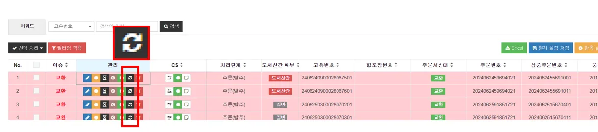 회수가 필요한 상품은 검은색 회전 화살표 아이콘(회수요청 아이콘)을 눌러 회수등록