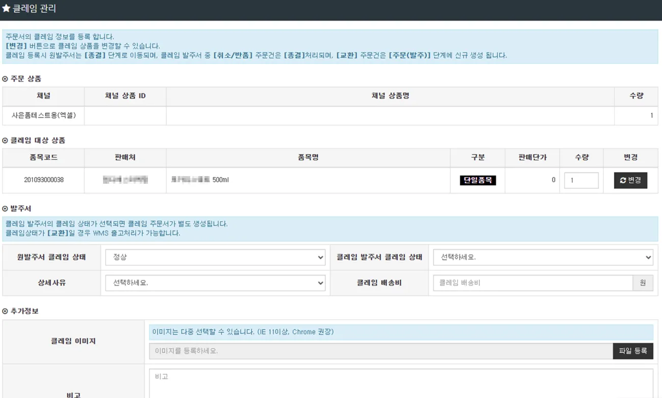 b. 클레임이 들어온 상품의 수량, 클레임 상태(교환/반품), 상세 사유 등을 입력하여 [확인]을 누릅니다.