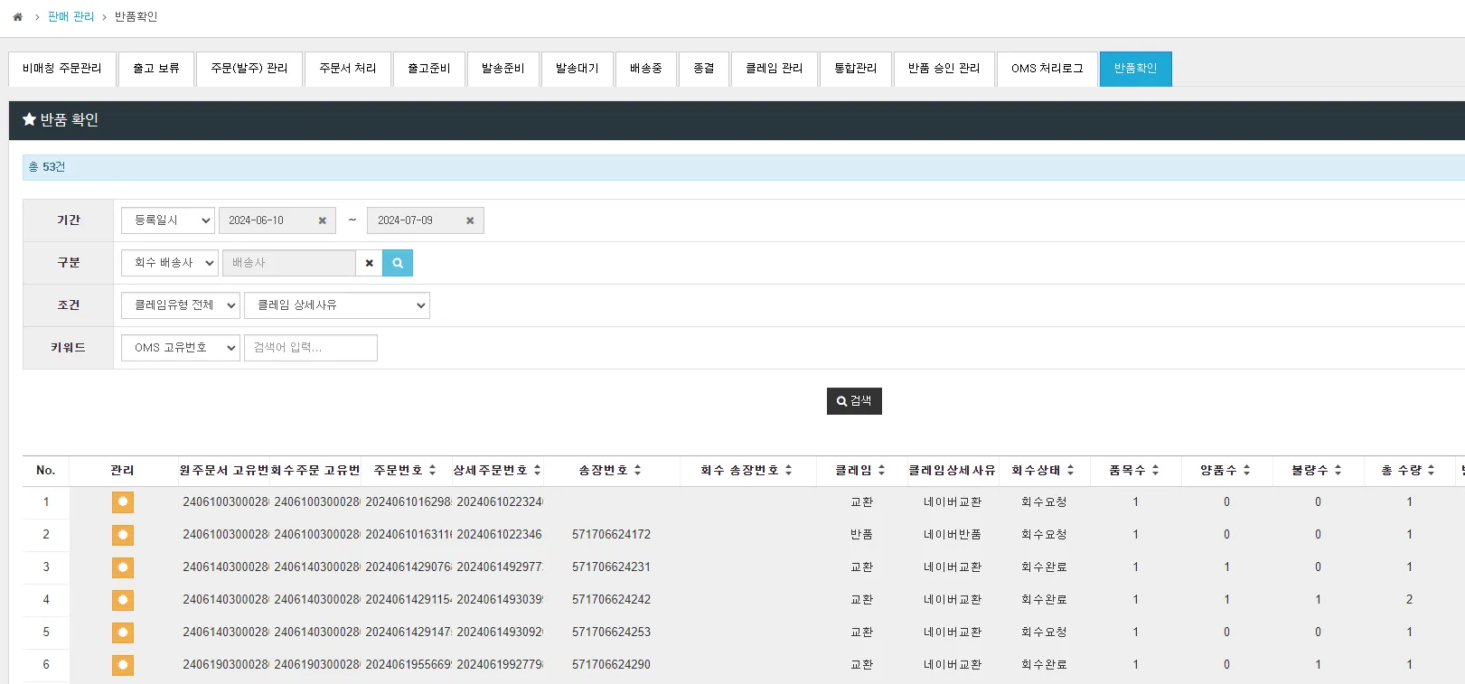 네이버에서 소비자가 직접 교환/반품을 요청한 건은 OMS에 클레임 및 회수요청이 자동 등록됩니다.
