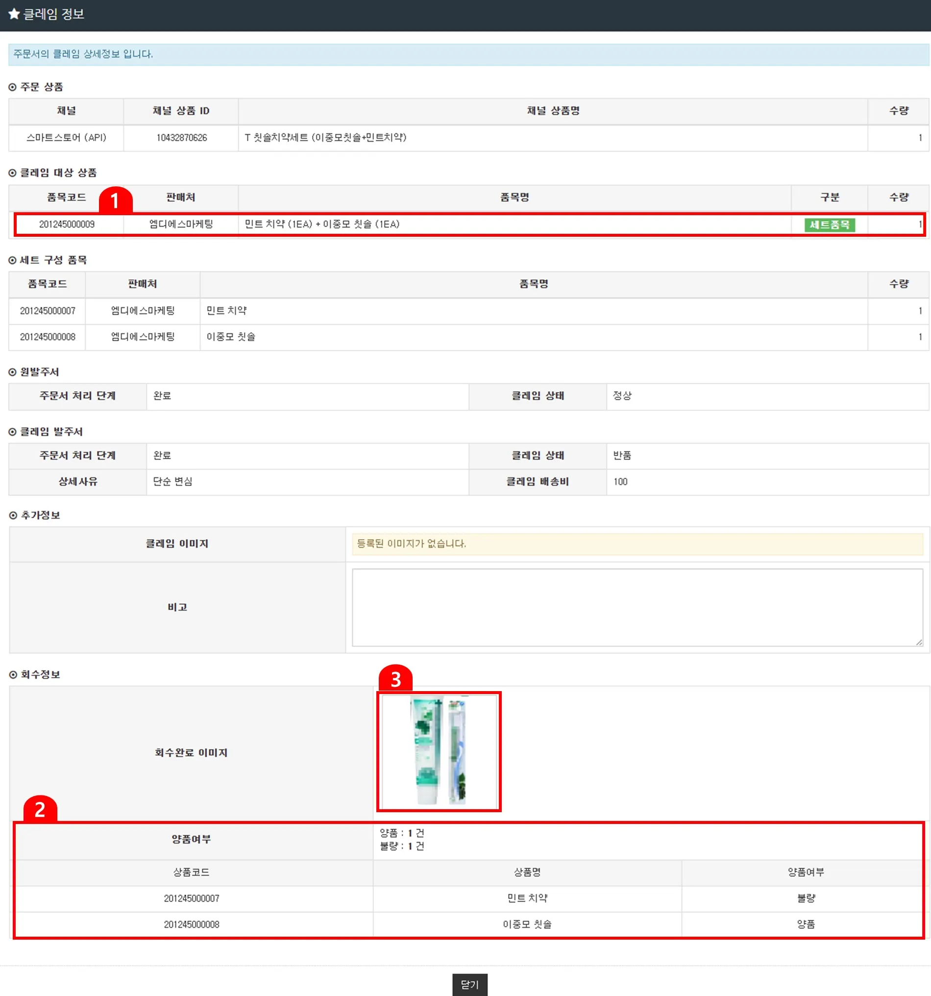 ‘관리’ 아이콘을 누르면, 해당주문의 클레임 정보(①회수 제품 및 수량, ②양품 및 불량 여부, ③회수된 사진) 확인 가능