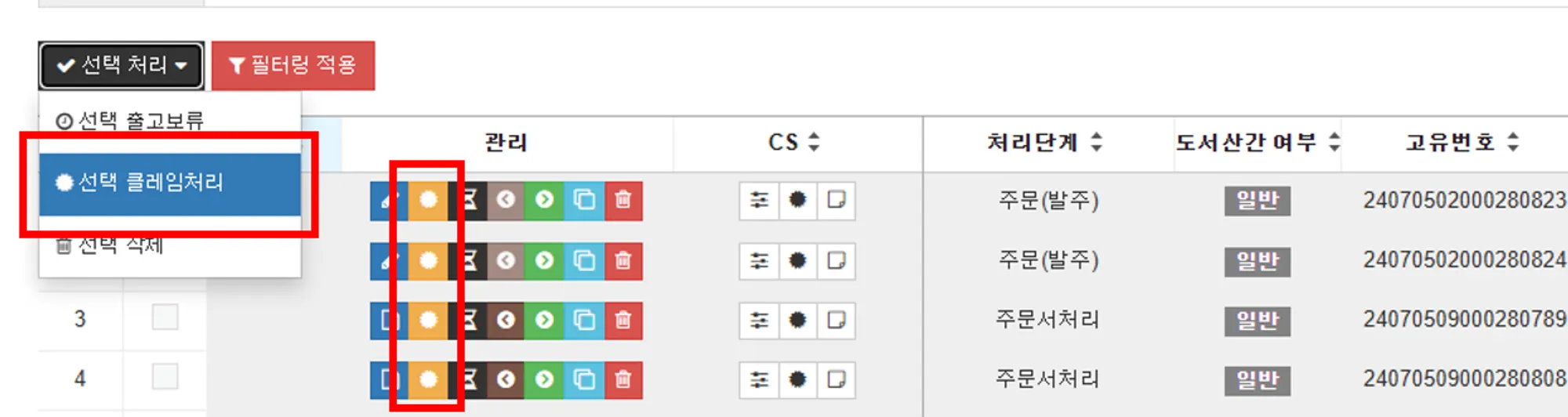 여러 줄에 대해 클레임을 등록할 때 : 노란 톱니바퀴가 아닌 체크박스 선택 > 선택처리 > 선택 클레임처리 버튼을 통해 여러줄을 동시에 클레임 등록