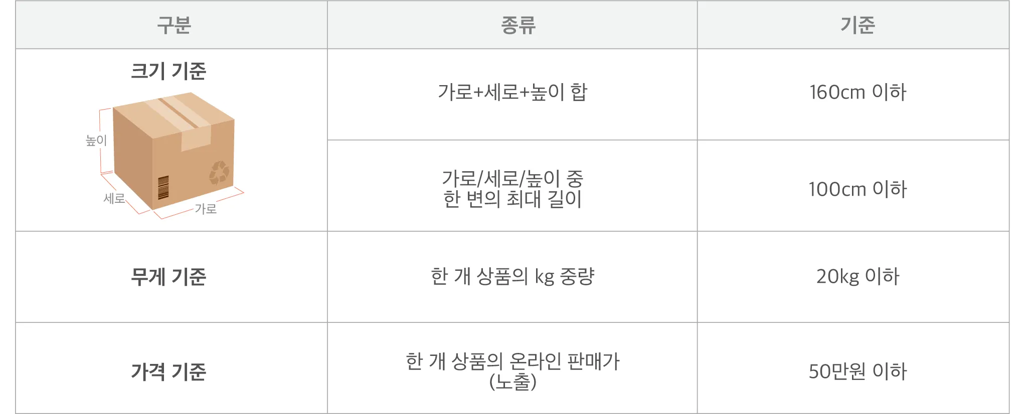 물품 길이 기준, 무게 기준, 가격 기준 초과하는 상품은 취급 불가한가요?
