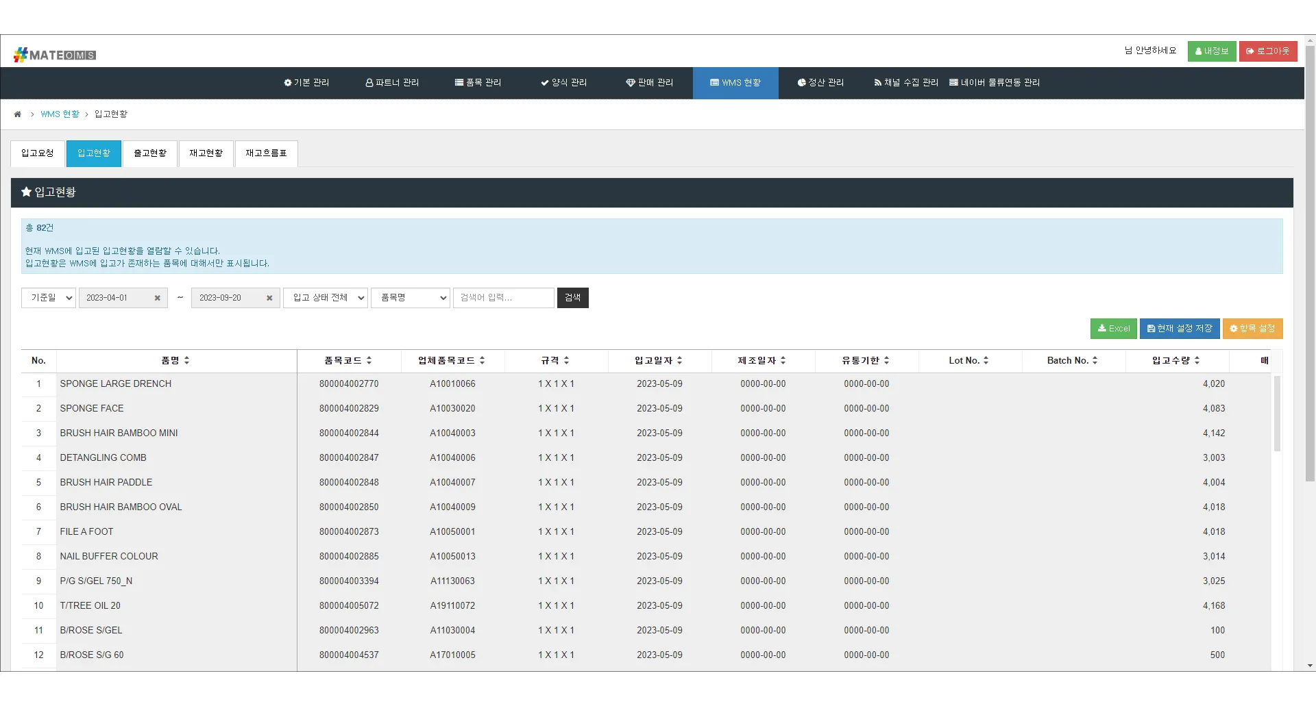 1. #MATE [WMS 현황] > [입고현황]에서 원하는 기간을 선택하여 입고 결과 확인 가능