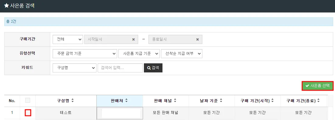 사은품 ‘적용 유형 선택’ > ‘적용 사은품 검색’ (사은품 등록 시 설정한 사은품 구성명으로 구분 가능)