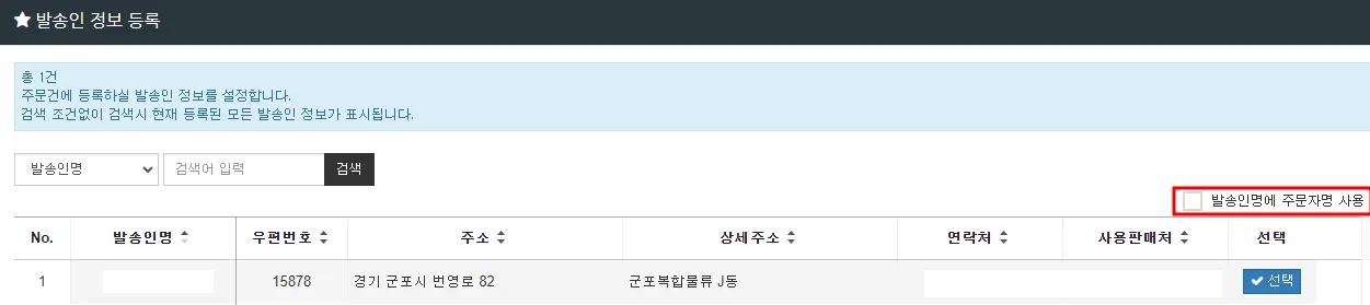 선물세트 주문 건 등 주문자명을 송장 내 표시하고 싶을 경우, ‘발송인명에 주문자명 사용’ 체크 후 등록