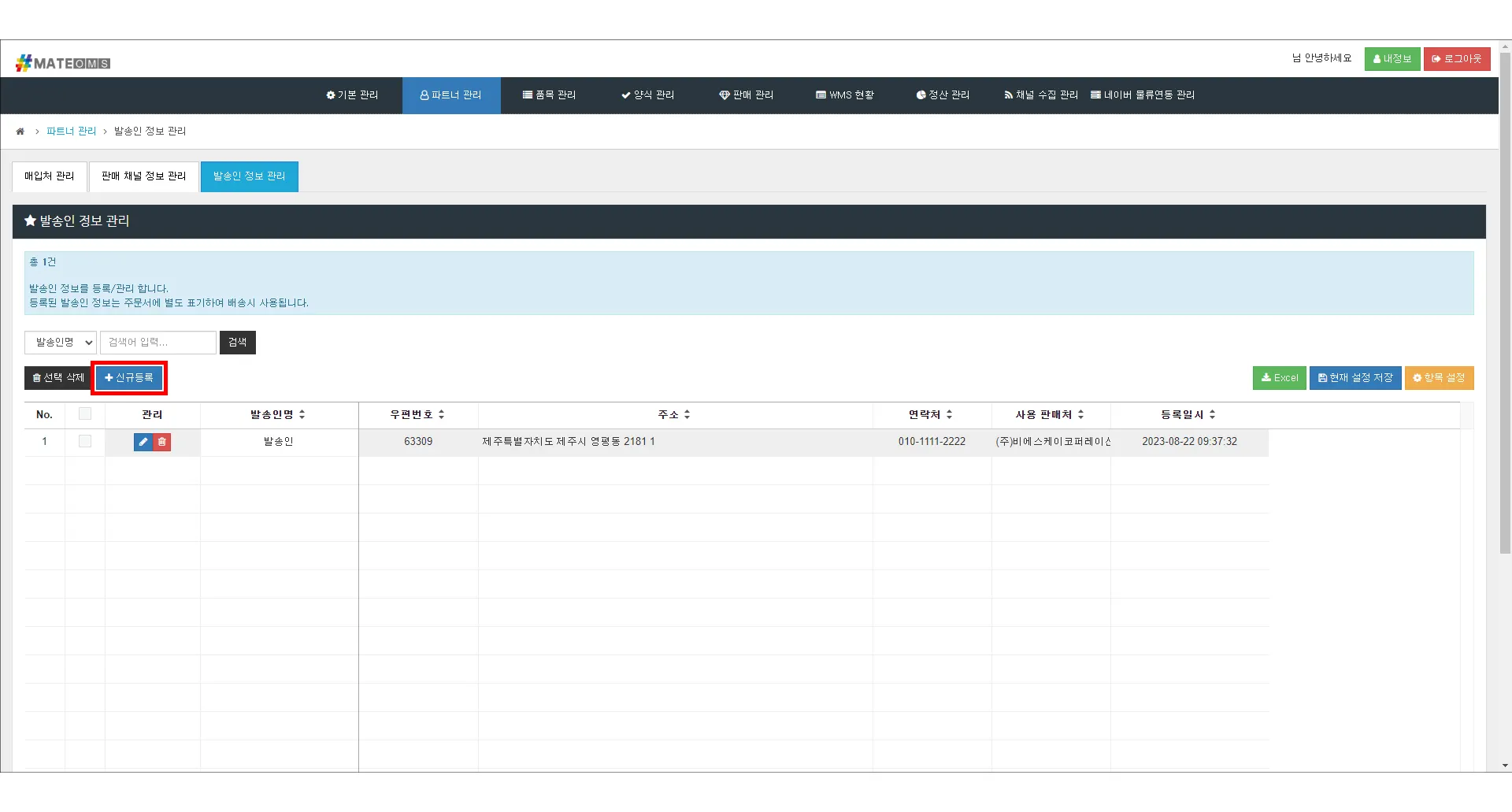 1. [파트너 관리] > [발송인 정보 관리]에서 ‘+신규등록’ 버튼 클릭