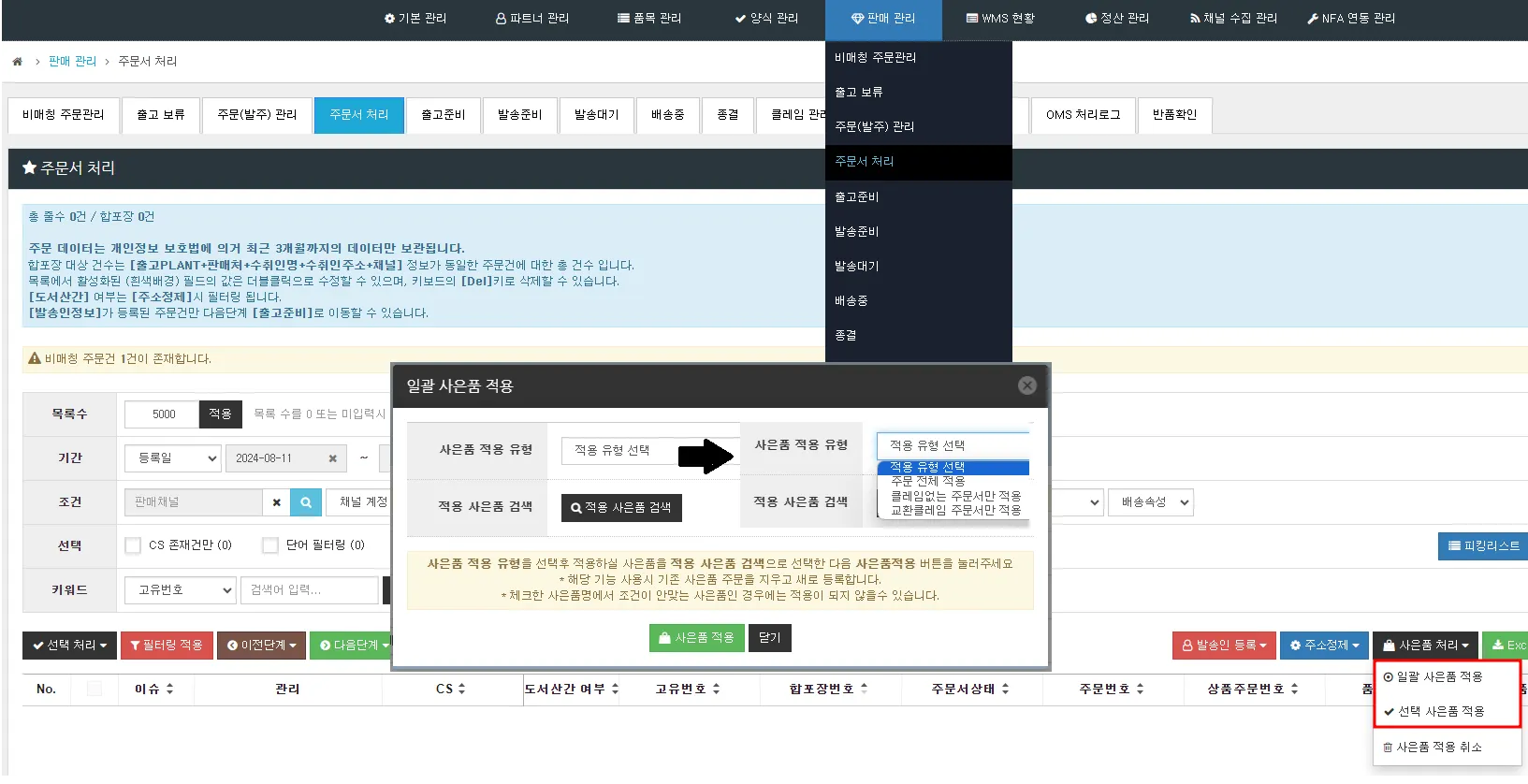 1. [판매 관리] > [주문서 처리]에서 ‘사은품 처리’ 버튼 클릭