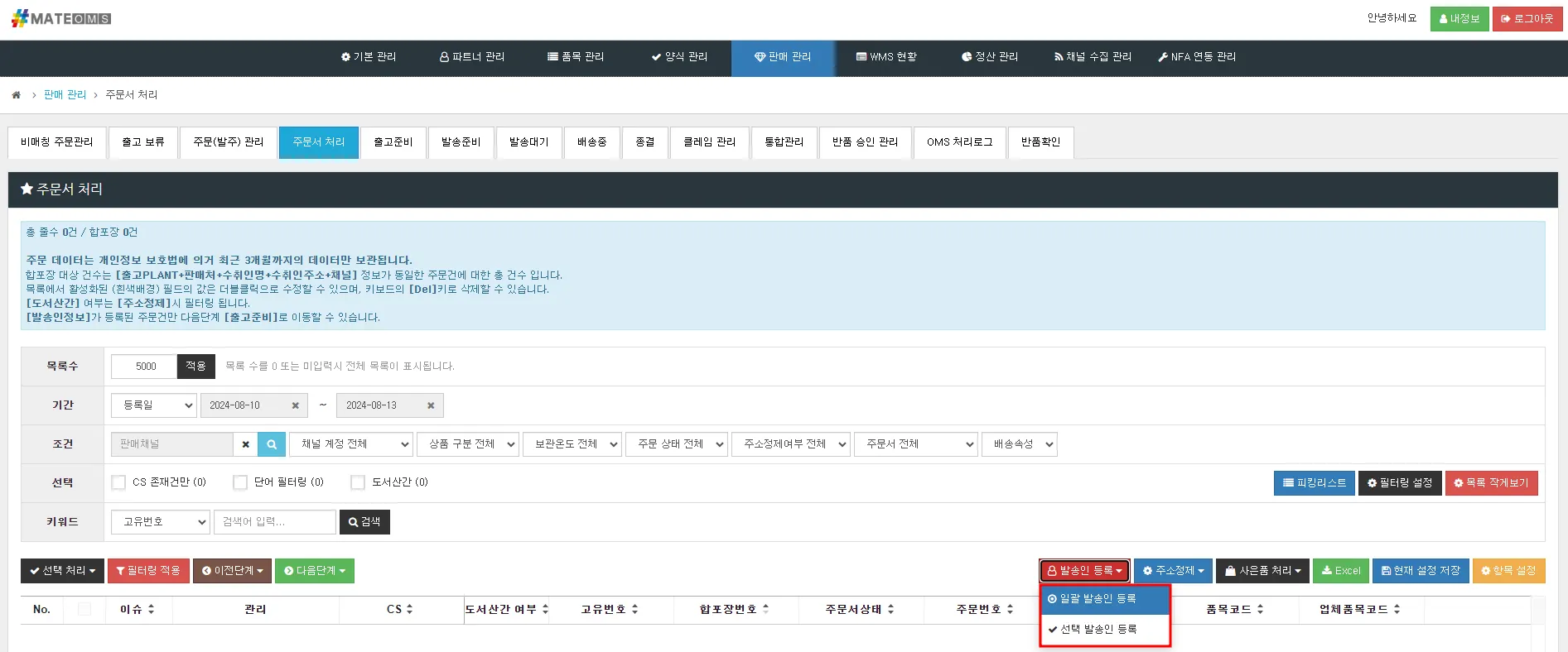 1. [판매 관리] > [주문서 처리] 주문 건 선택 후 ‘발송인 등록’ > ‘일괄 발송인 등록’ or ‘선택 발송인 등록’ 버튼 클릭