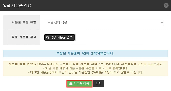 4. ‘사은품 적용’ 버튼 클릭하고 사은품 처리 완료