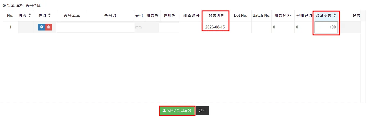 3. 제품 선택 후 유통기한, 입고수량 등 입고에 필요한 정보 추가 기재 후 [WMS 입고요청] 클릭
