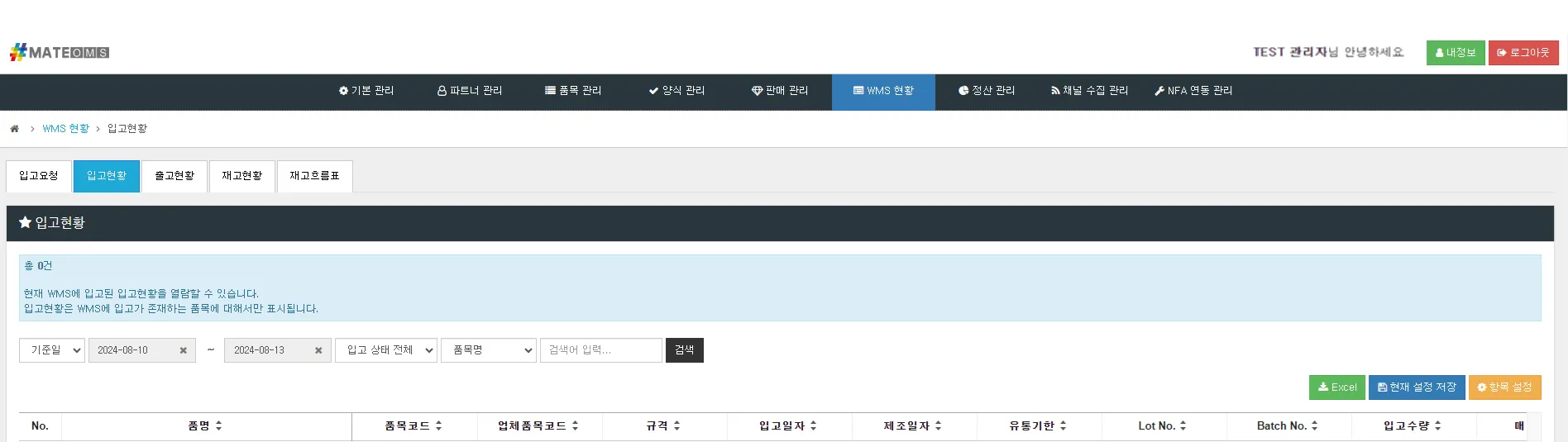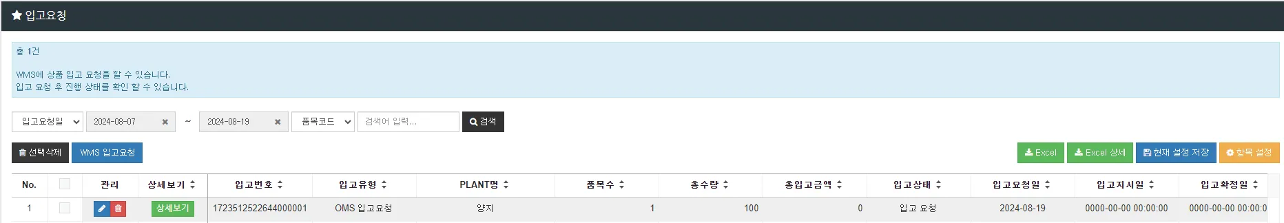 2. 현재 WMS에 등록된 입고관련 내역 조회