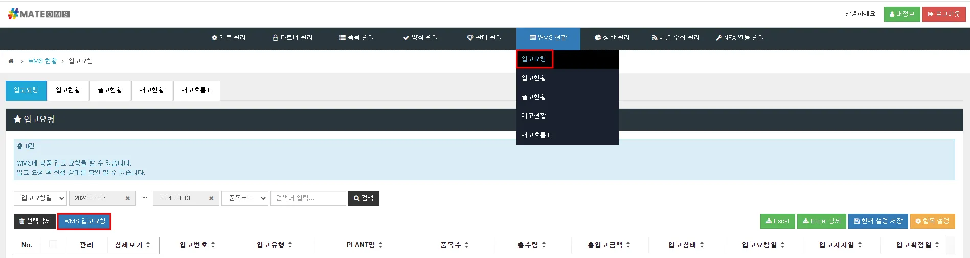 1. #MATE [WMS 현황] > [입고요청] > [WMS 입고요청] 클릭