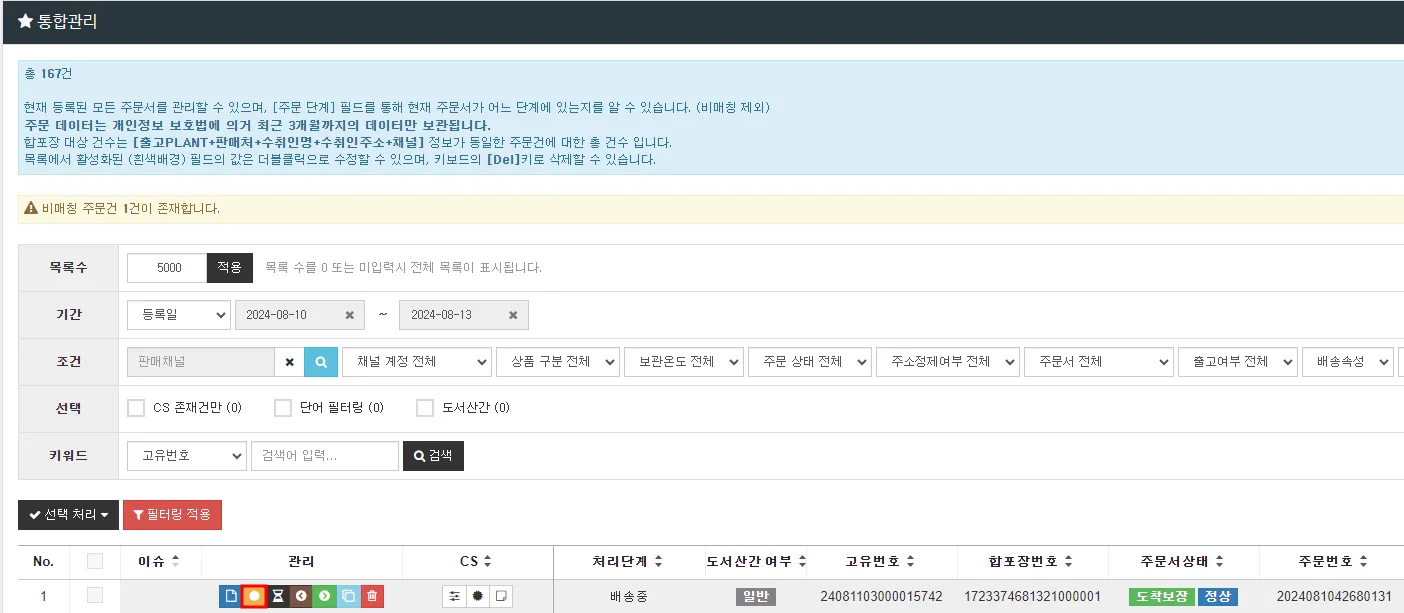 [판매 관리] 내 실제 주문 건(예 : 통합관리 조회 기준 ‘배송중’ 단계 이후의 주문 건) 대상으로 생성
