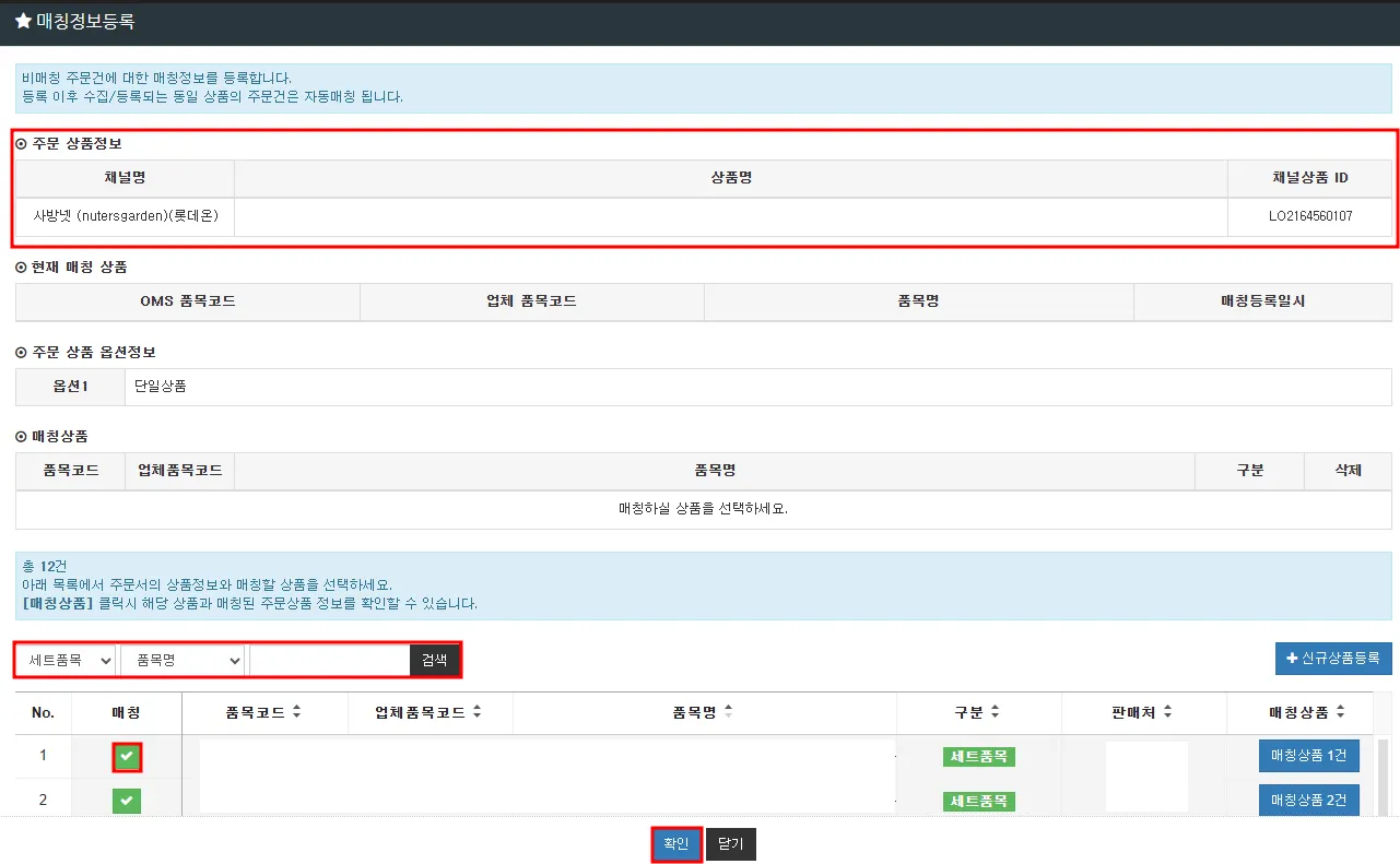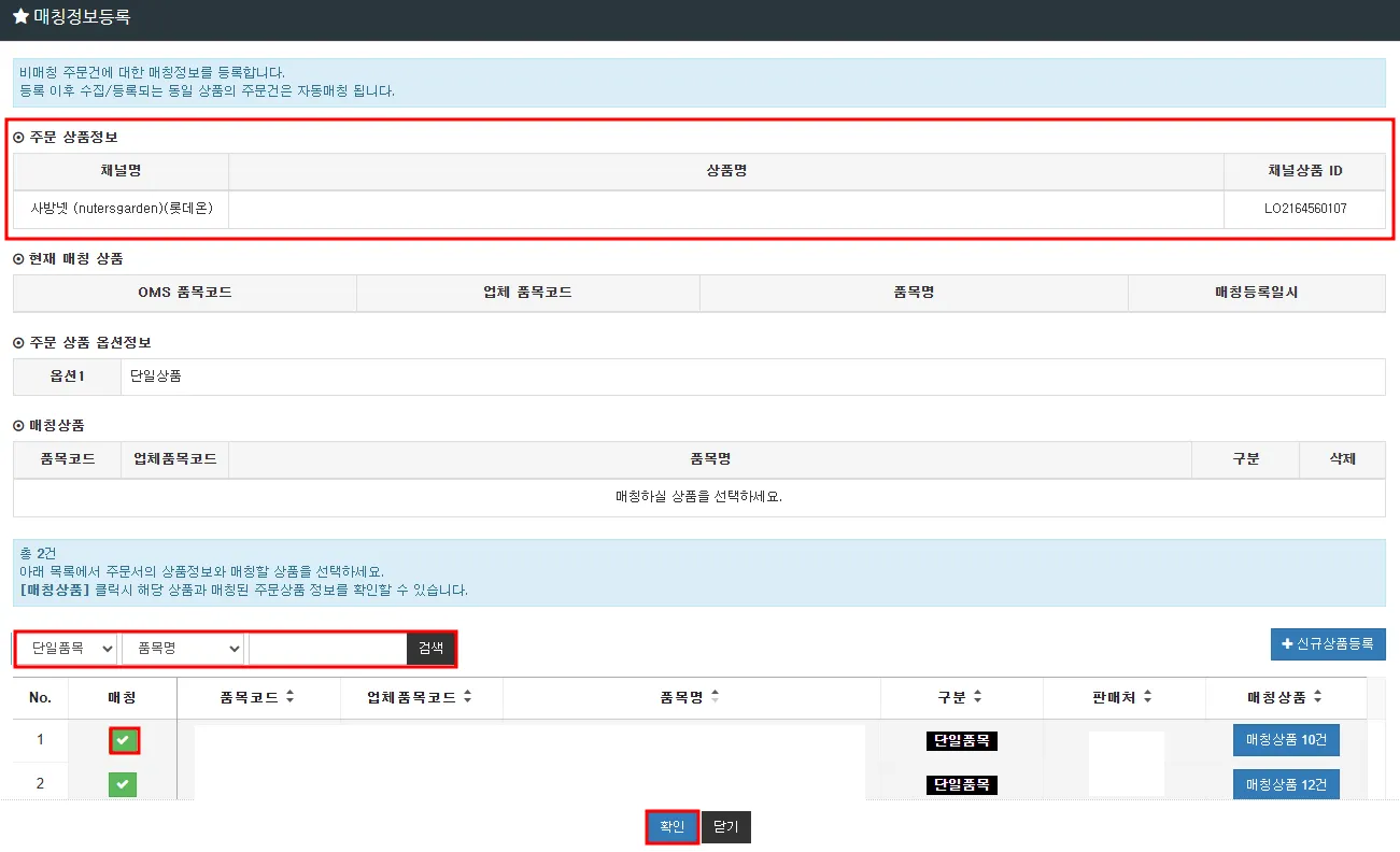 해당 품목 ‘매칭’ 체크 선택 후 ‘확인’