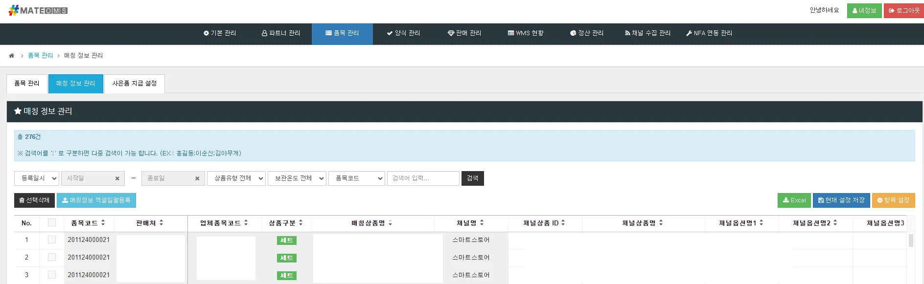 품목코드 ~ 매칭상품명 : OMS 시스템에 등록된 품목코드 및 매칭완료 품목 정보