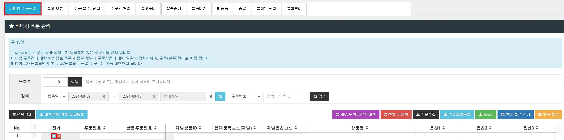 1. [판매 관리] > [비매칭 주문관리]