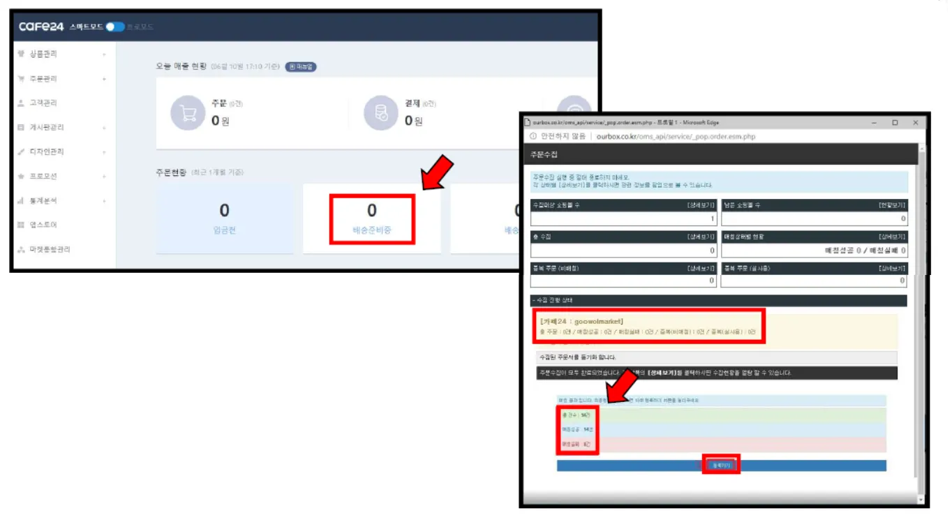 수집 총 건수와 해당 오픈마켓 주문 건수 비교 (누락 여부 체크, 건수가 상이할 시 운영 담당자에게 문의)