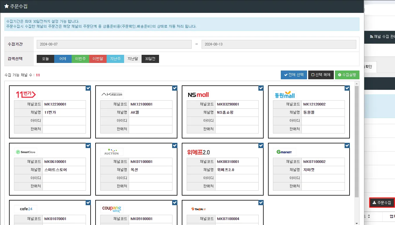 [주문수집] > [‘수집기간’ 자동설정 (별도 설정 필요할 경우 일자조정)] > [전체선택 자동세팅 (별도 수집채널 선택 필요할 경우에 개별 선택)] → [수집실행]