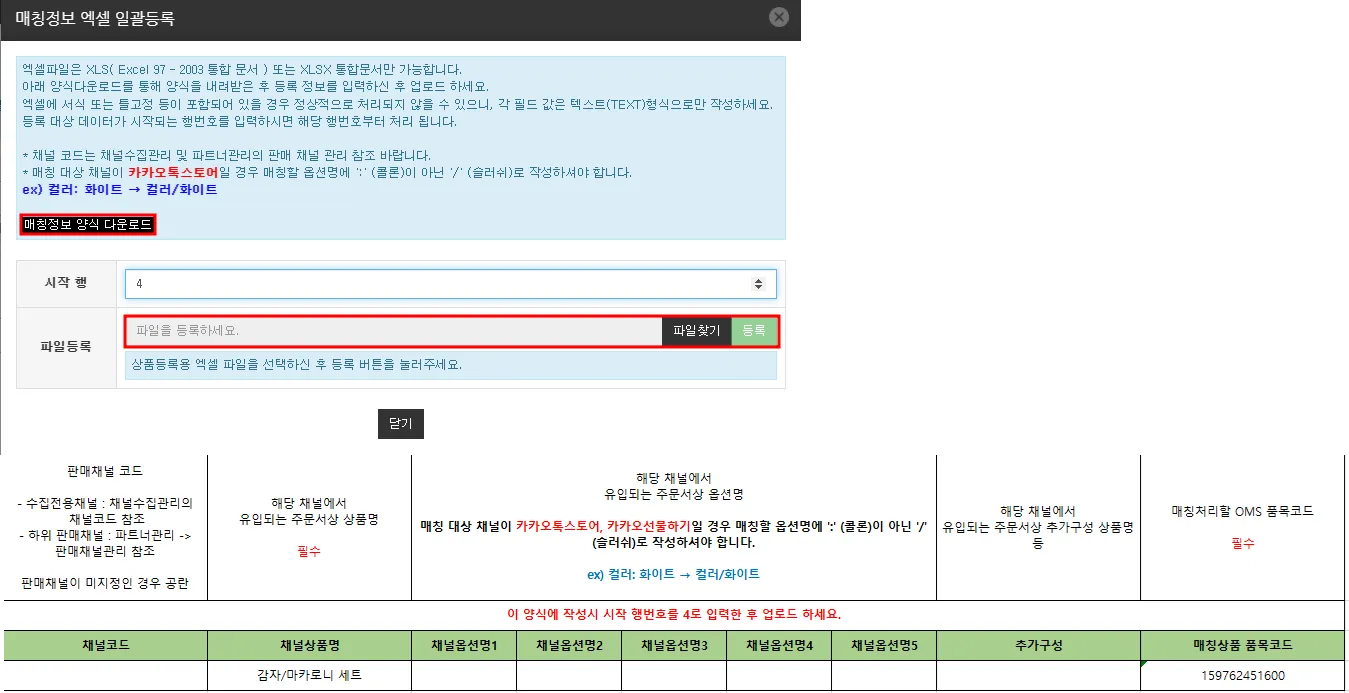 상품-주문 매칭정보를 양식에 기입 후 ‘등록’ 버튼 누르고 해당 파일 업로드